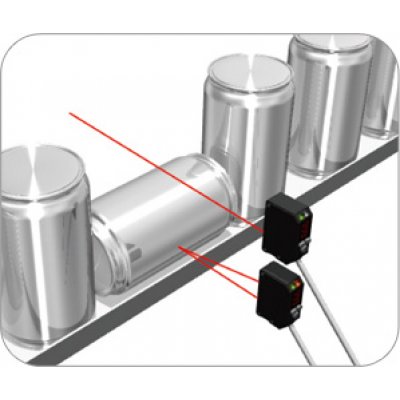 Con un solo sensor CMOS laser con supresión de fondo BGS-HL puede detectar una lata que se ha caido en la cinta transportadora. Este sensor tiene una nueva función llamada "ZONE teaching" que hace muy facil la configuración y detección de la altura a la que se encuentra el objeto que está en la zona.